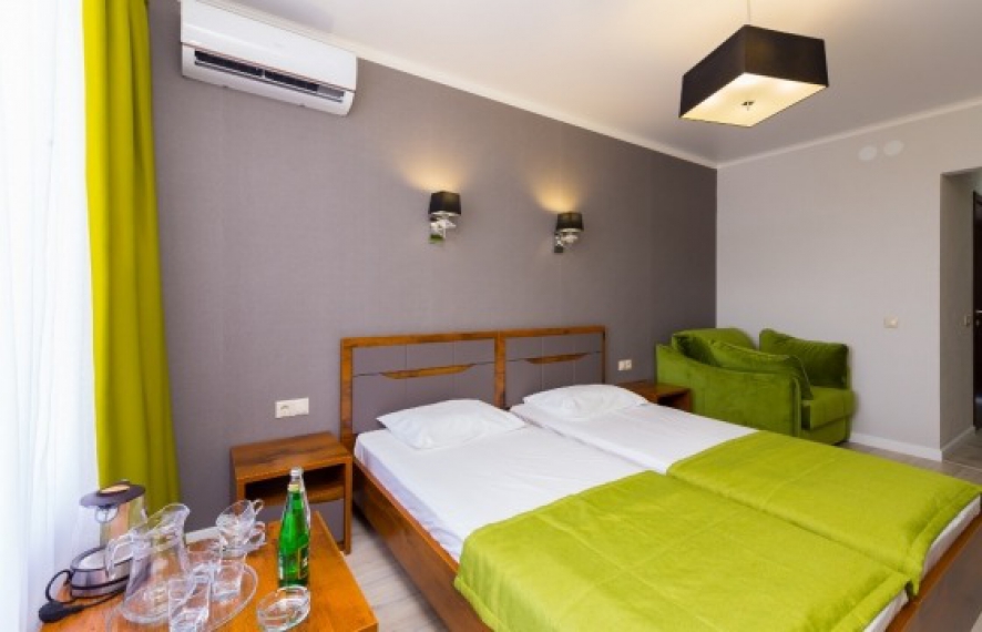 В номере: две 1-спальные кровати, прикроватные тумбочки, телевизор, диван, холодильник, кресло-кровать, тепловентилятор, вентилятор.