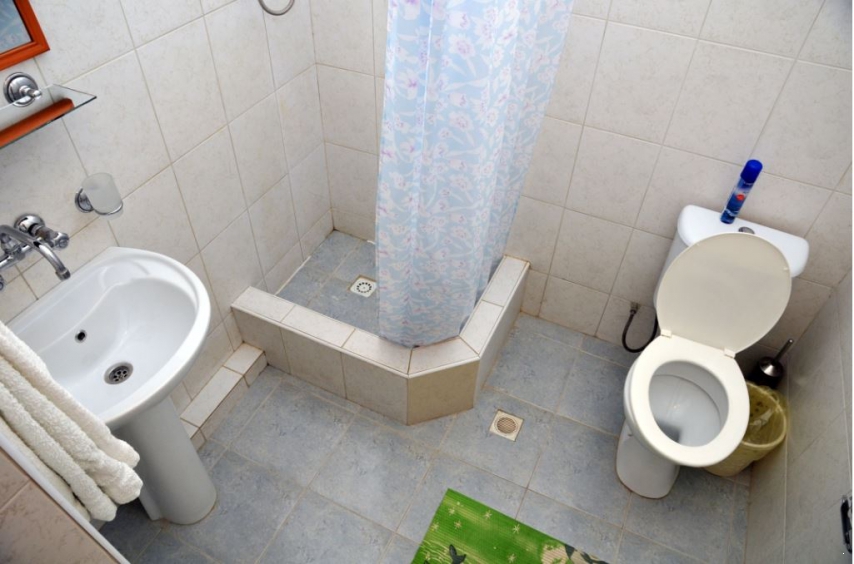 Санузел: умывальник, зеркало, унитаз, полотенца, душевая кабина.